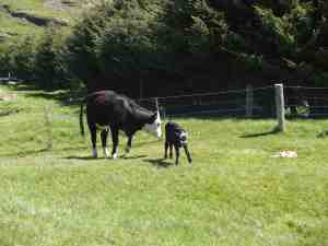 PaMan assistent sur la route du retour à la délivrance d’un veau (sa maman l’aide à tenir debout, c’est trop mignon!),