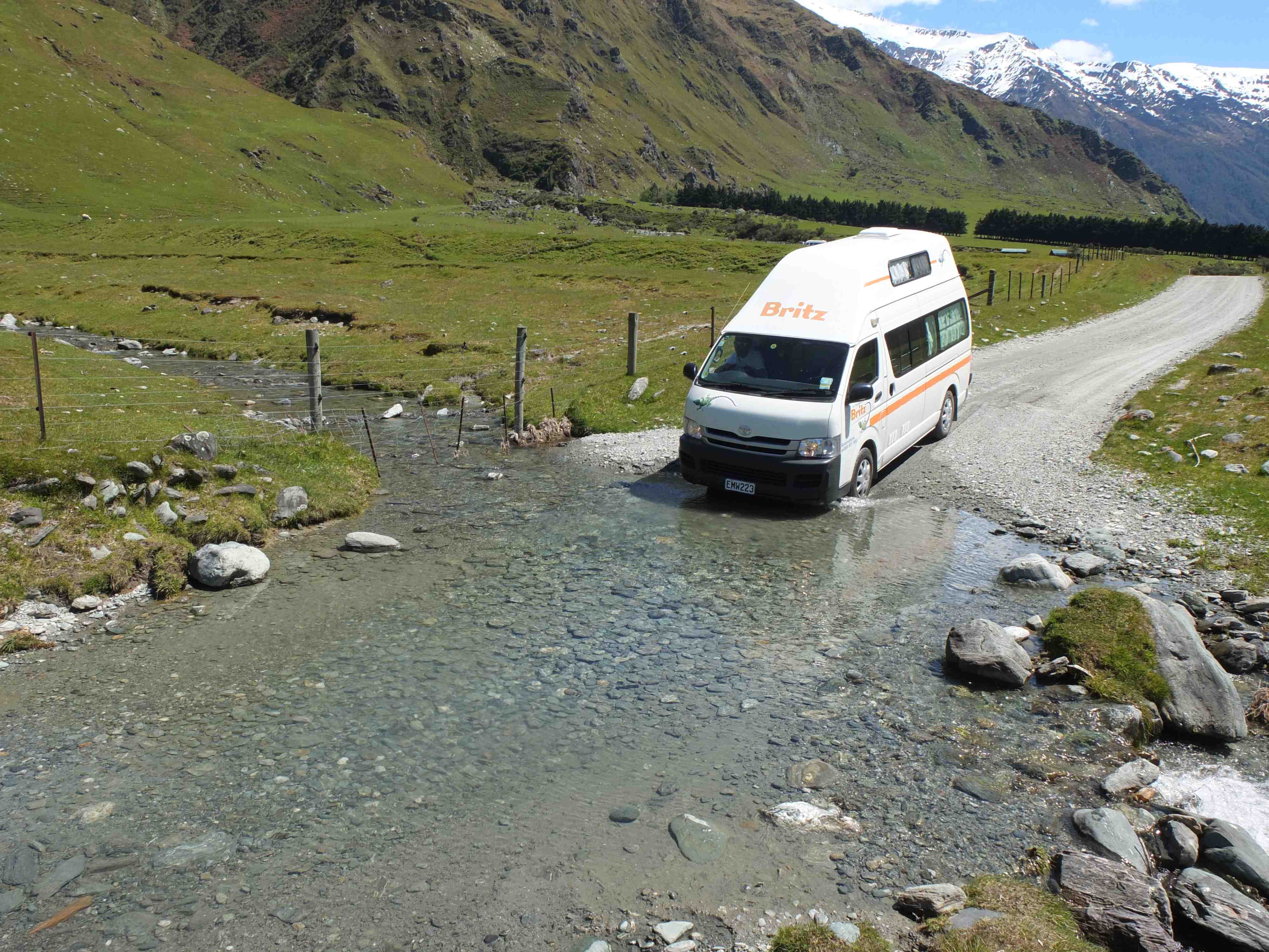 Le temps est effectivement magnifique, surtout comparé à celui que nous avons du affronter (je pèse mes mots) il y a quelques jours, avec des rafales à 130km/h…. Pas un nuage ne parsème le ciel, et nous nous préparons donc au petit matin à une approche de 50km, surtout en gravel road, avec passages de gué à la clef…… Tout ça avec notre bon vieux Britz (ne dites à personne que nous trompons la confiance de notre assureur…)!!!